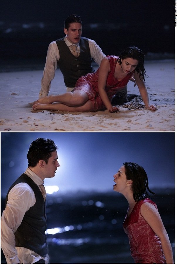 Fotos de cenas da novela Gabriela: Lindinalva (Giovanna Lancellotti) acorda após tentativa de se afogar no mar e ofende Juvenal (Marco Pigossi) que lhe salvou.