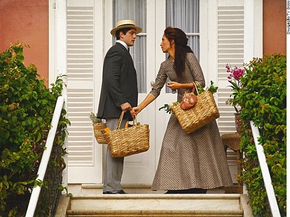 Foto de cena da novela Lado a Lado da TV Globo: Albertinho (Rafael Cardoso) acompanha Isabel (Camila Pitanga) até a casa de madame Besançon. Se fingindo de bom moço, ele carrega as compras da jovem…Leia mais
